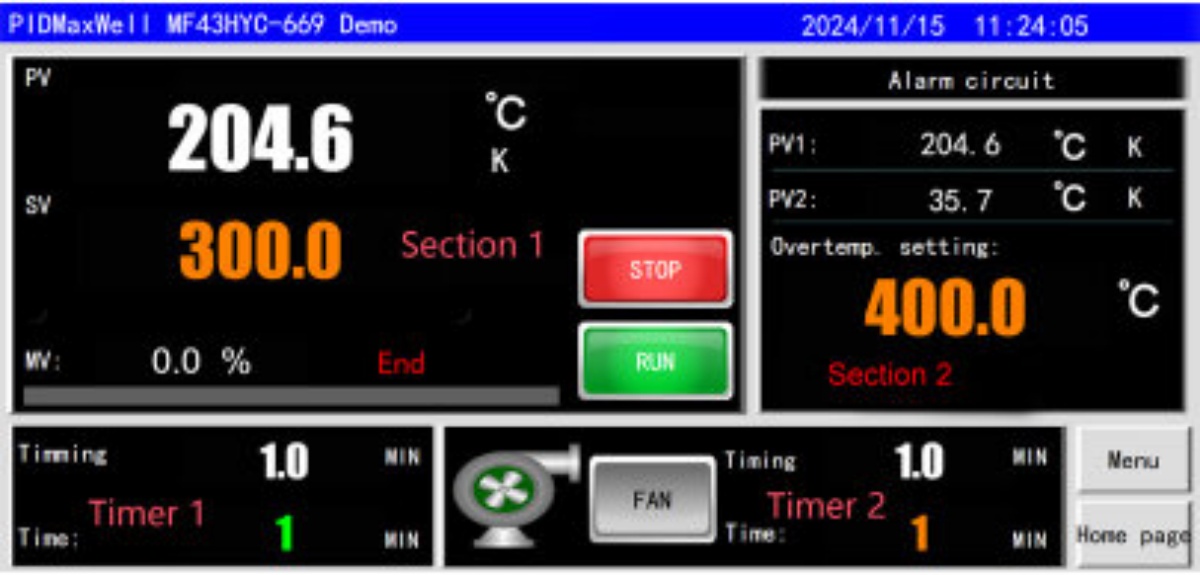 MF43HYC-652A is a 4 channel touch screen temperature controller, works with 4 input and 4 outputs, support thermocouple inputs and output is optional between, SSR Drive, 4-20mA or Realy, PC and cell phone compatible, Modbus TCP/IP optional, 4.3'' touch screen, datalogging feature, with USB, WIFI, and Ethernet port. Operation interface in English, Chinese and Spanish.