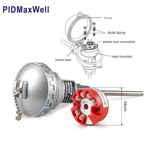 Head-mount temperature transmitter is a device installed directly in the connection head of a temperature sensors, temperature sensor typically will be thermocouple or RTDs, the key feature of temperature transmitter is to convert small and raw signal from the sensor into analog signal like 4-20mA, the transmitter has various options such as isolated type, Hart version, Modbus RS-485 compatible version, below is an image on how it looks like and the way it is installed inside the connection head