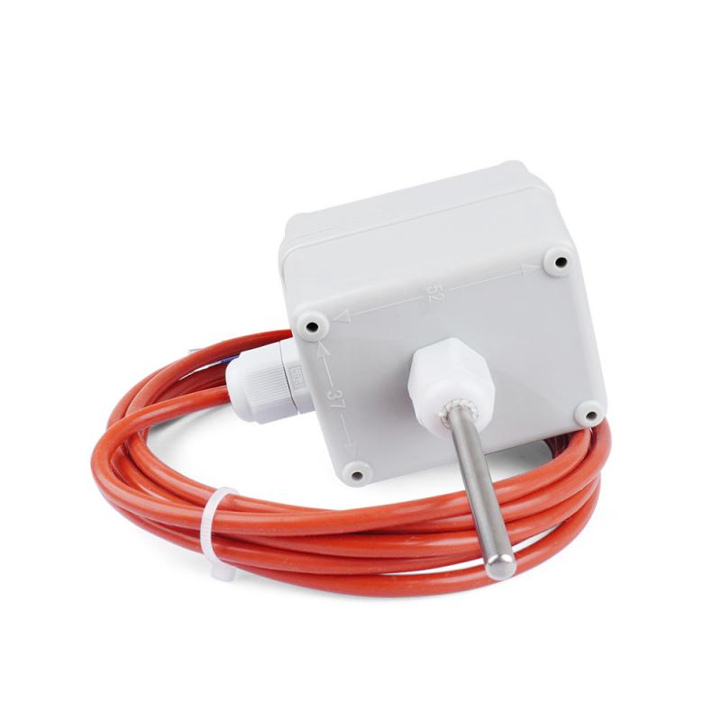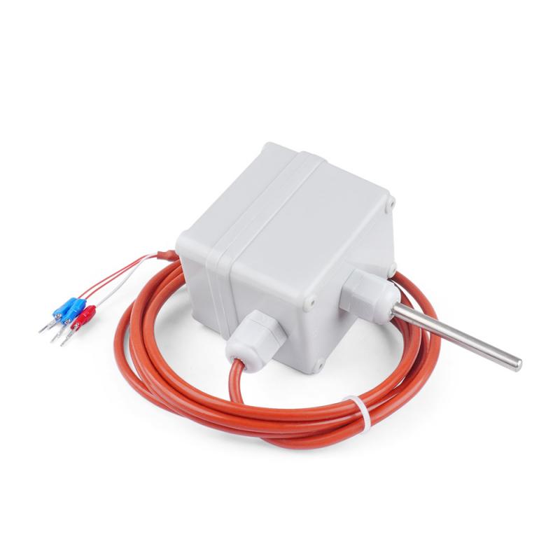 The COMCONNECT CST-A-PT-2MS is a high-precision RTD temperature sensor designed for industrial and laboratory applications ranging from -20°C to 400°C. It features a PT100 Class A sensing element for superior accuracy and a 3-wire configuration to eliminate lead resistance errors. The sensor comes in a rugged waterproof enclosure (50.3×65.6×55.9mm) and a 2-meter shielded silicone cable (red, 3×7×0.15mm) for reliable signal transmission in harsh environments. The stainless steel probe (5×50mm) ensures fast thermal response. Customization options are available for probe dimensions, box size, and cable types.