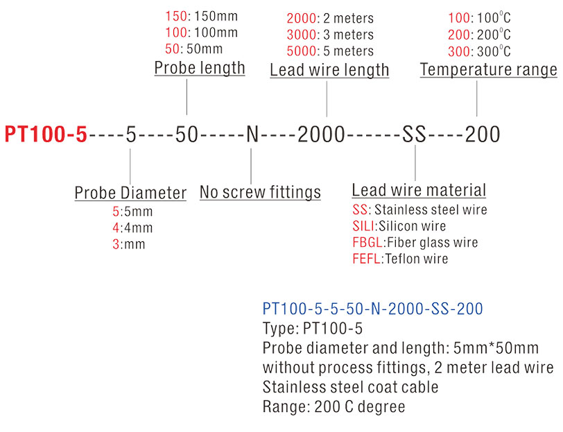 | PT100-5-5-100-N-2000-SS-200 | 5 mm dia., 100 mm length, 2 m SS braided cable, 200 °C — Most common configuration |