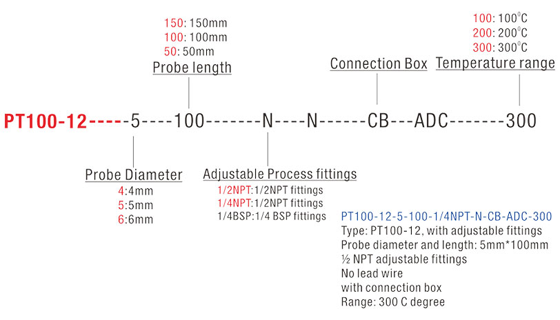 PT100-12 — [Probe Diameter] — [Probe Length] — [Adjustable Process Fitting] — [Lead Wire] — [Connection Box] — [Temperature Range]