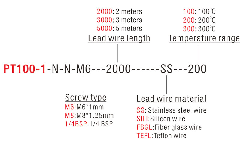 | ③ | Lead Wire Material | SS = Stainless steel braided | SILI = Silicone | FBGL = Fibre glass | TEFL = PTFE/Teflon |